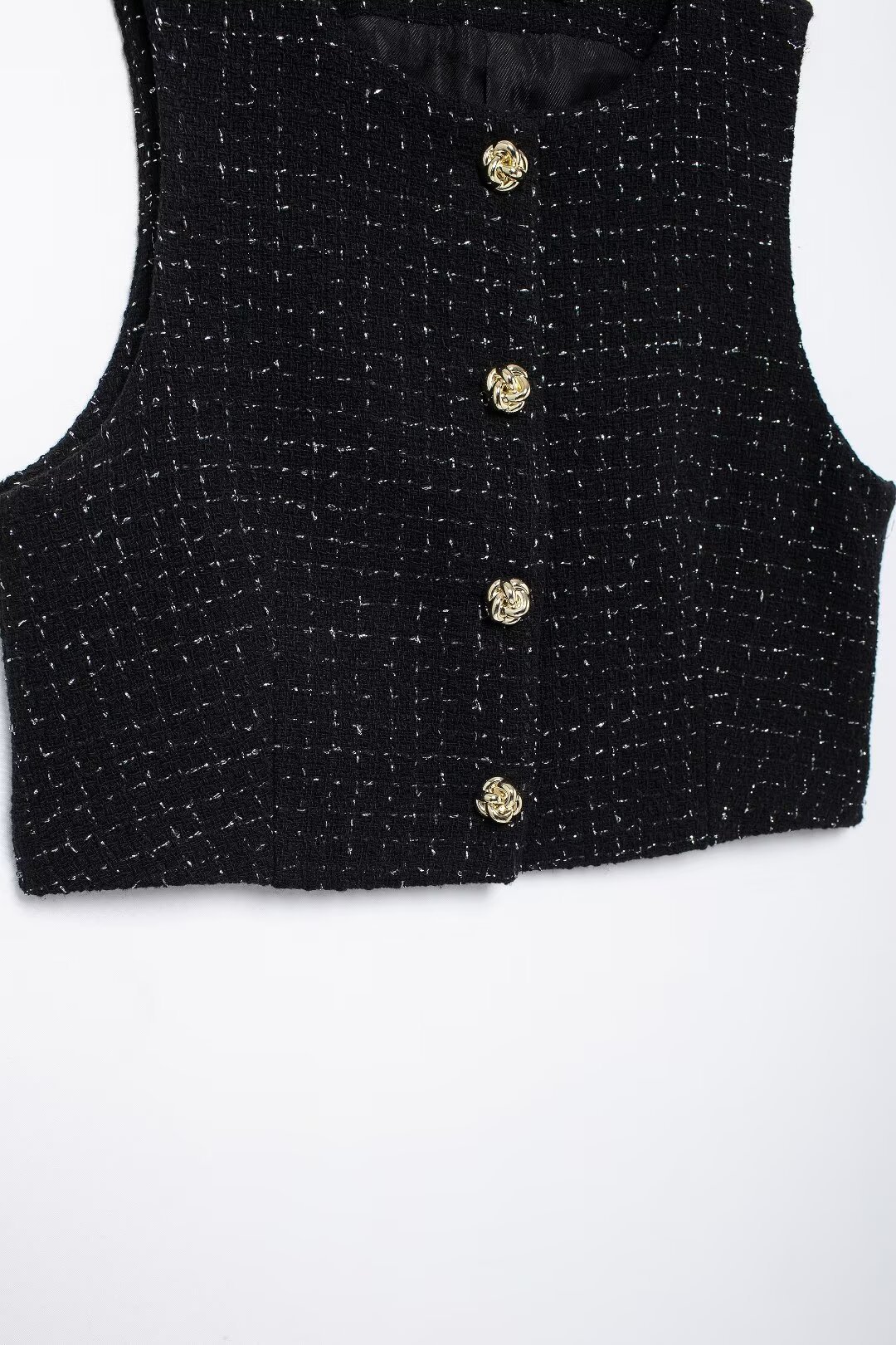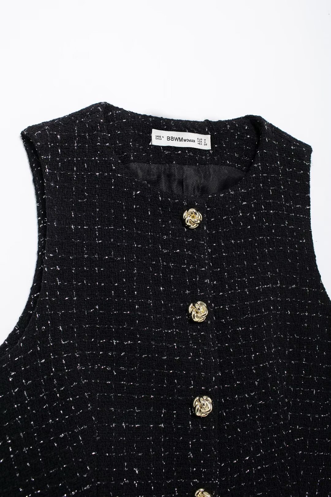 Textured Sleeveless O-neck Short Tweed Sleeveless Waistcoat Outerwear